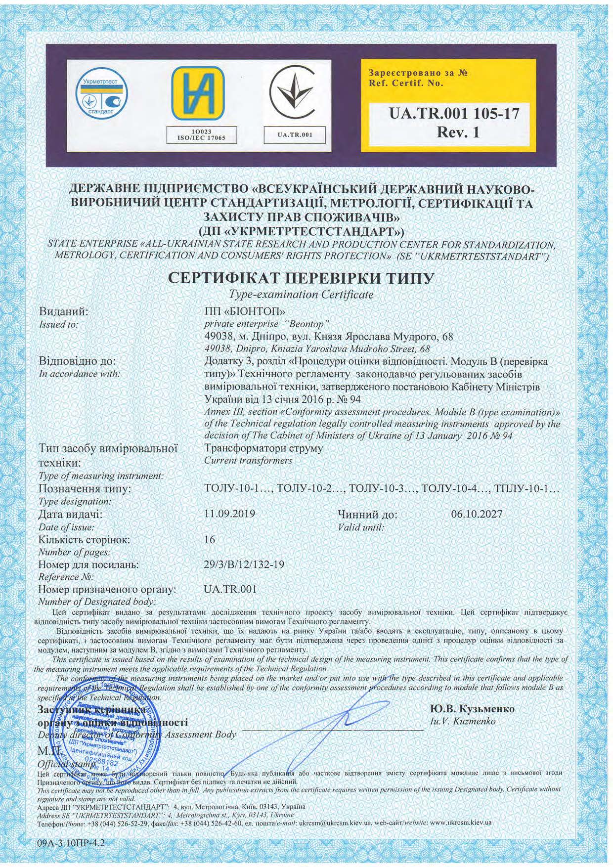 Трансформатори проходять процедуру оцінки відповідності за модулями B+F, згідно Технічного регламенту законодавчо регульованих засобів вимірювальної техніки.